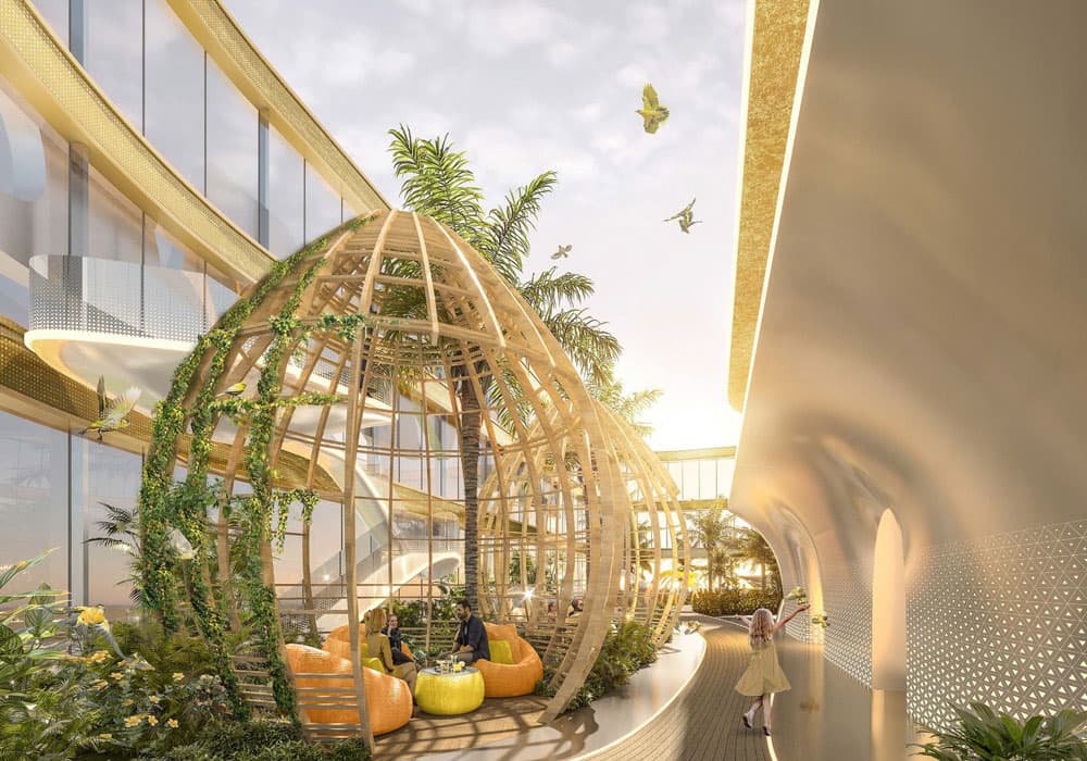 محوطه‌های سرسبز و مسیرهای پیاده‌روی طراحی‌شده با الهام از سنگ یاقوت زرد